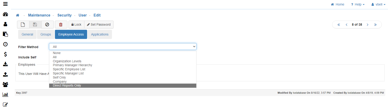 The Filter Method allows you to define whom the User can view in the software from the HR list. There are many ways to filter through the Employees a User can have access to. (Such as Specific Employees, All Employees, Company, Direct Reports Only, etc.) These different Filter methods are helpful if some Employees work in multiple locations and have multiple Managers who need access to their information (I.e. Organization Level Filter).