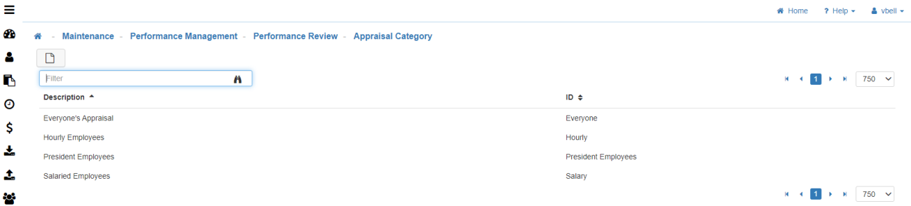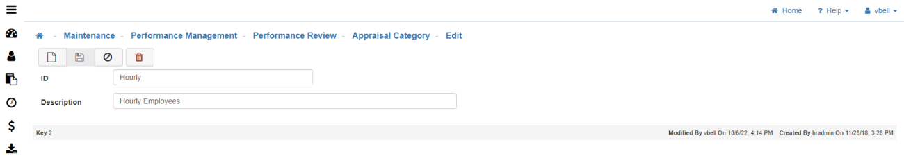 Upon navigation into the Appraisal Category Maintenance, you will see a list of all configured Appraisal Categories. You’re also able to create new Appraisal Categories that will be available for selection to provide additional meaning while creating a new 'Appraisal', or for assignment in an 'Appraisal Template'.