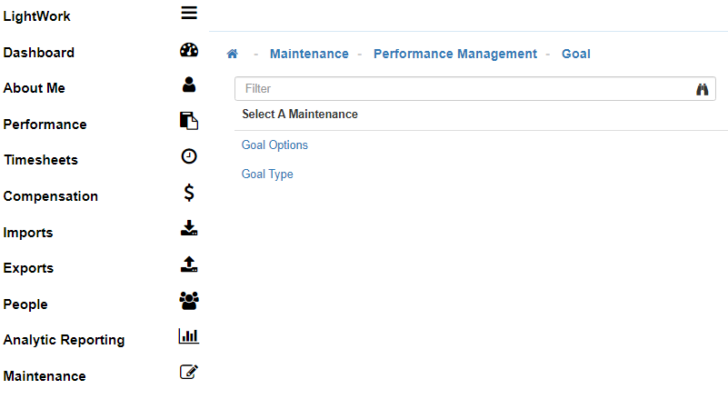 The Goal Maintenance is where you setup the Goals and Team Goals function within your LightWork system. I.e. Available fields when creating a Goal, Privacy Settings, who is allowed to create a Goal, as well as editing and deletion rights.