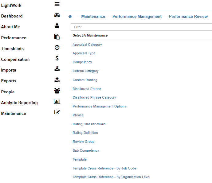 The Performance Review Maintenance gives you access to the setup of each part of the Appraisal process.