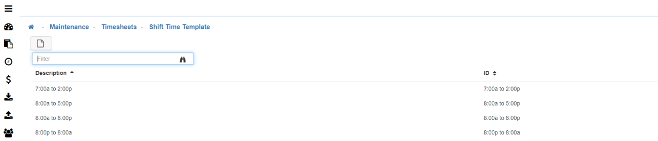 Upon navigation into 'Shift Time Template Maintenance', you will see a list of all configured Shifts Time Templates available for selection within the schedules module in Time. Each Company has specific time slots and this is where those 'Shift Times' are defined. -